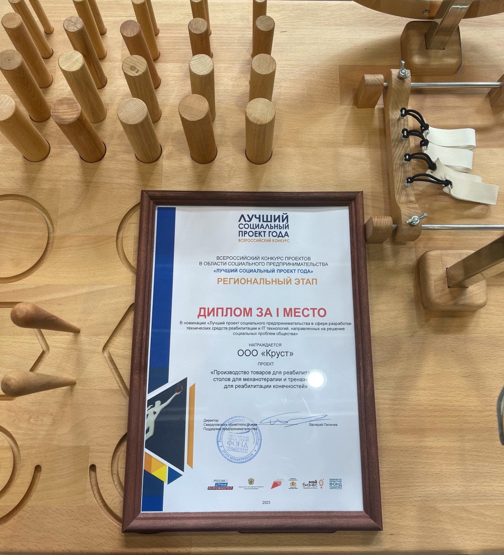 В ходе регионального этапа в номинации «Лучший проект социального предпринимательства в сфере разработки технических средств реабилитации и IT технологий, направленных на решение социальных проблем общества» ООО «Круст» получило награду за проект «Производство товаров для реабилитации: столов для механотерапии и тренажеров для реабилитации конечностей».